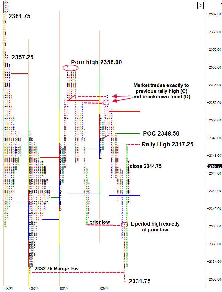 A sharp spike lower in F period ran the stops below the near matching C/D/E lows, but with no continuation the market bounced back to the developing 6 TPO wide point of control at 2348.50, widening to 8 TPO’s by H period.
