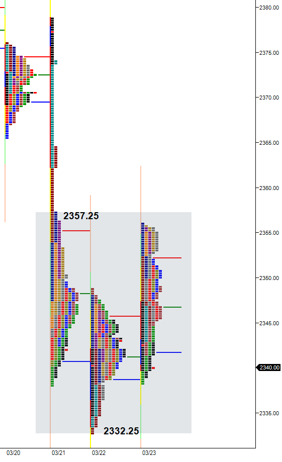 The market is in a three day balance between Tuesday’s selloff lower distribution high at 2357.25 and Wednesday’s low at 2332.25, which corresponds to near matching lows from February 16/17. If traders do not like the results of Friday’s House vote the potential exists of a downside breakout, potentially hitting stops below the balance low.